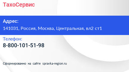 ТахоСервис по адресу 141031, Россия, Москва, Центральная, вл2 ст1 в дальнейшем Организация, размещена в следующих категориях: