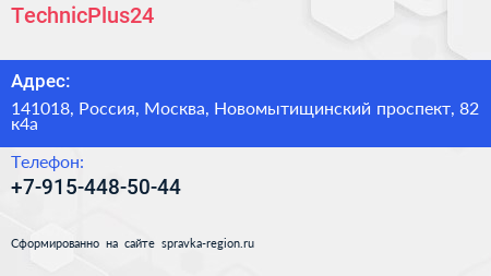 TechnicPlus24 по адресу 141018, Россия, Москва, Новомытищинский проспект, 82 к4а в дальнейшем Организация, размещена в следующих категориях: