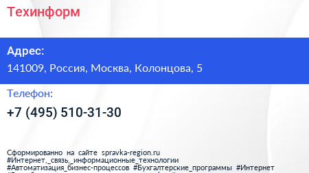 Техинформ по адресу 141009, Россия, Москва, Колонцова, 5 в дальнейшем Организация, размещена в следующих категориях: