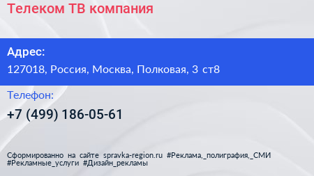 Телеком ТВ, компания по адресу 127018, Россия, Москва, Полковая, 3 ст8 в дальнейшем Организация, размещена в следующих категориях: