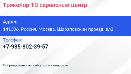 Триколор ТВ, сервисный центр по адресу 141006, Россия, Москва, Шараповский проезд, вл2 в дальнейшем Организация, размещена в следующих категориях: