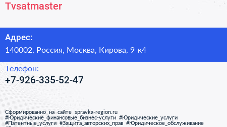 Tvsatmaster по адресу 140002, Россия, Москва, Кирова, 9 к4 в дальнейшем Организация, размещена в следующих категориях: