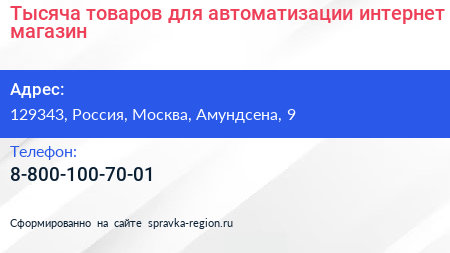 Тысяча товаров для автоматизации, интернет-магазин по адресу 129343, Россия, Москва, Амундсена, 9 в дальнейшем Организация, размещена в следующих категориях:
