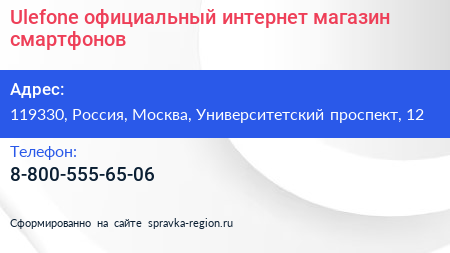 Ulefone, официальный интернет-магазин смартфонов по адресу 119330, Россия, Москва, Университетский проспект, 12 в дальнейшем Организация, размещена в следующих категориях: