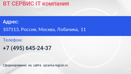 ВТ СЕРВИС, IT-компания по адресу 107113, Россия, Москва, Лобачика, 11 в дальнейшем Организация, размещена в следующих категориях: