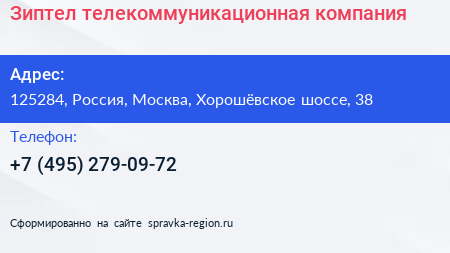 Зиптел, телекоммуникационная компания по адресу 125284, Россия, Москва, Хорошёвское шоссе, 38 в дальнейшем Организация, размещена в следующих категориях: