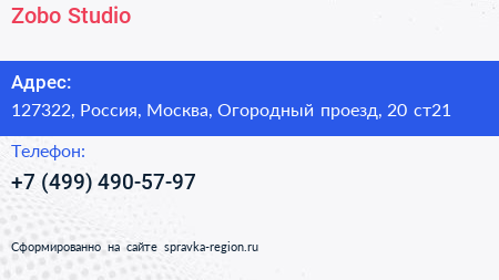 Zobo Studio по адресу 127322, Россия, Москва, Огородный проезд, 20 ст21 в дальнейшем Организация, размещена в следующих категориях: