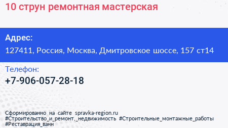 10 струн, ремонтная мастерская по адресу 127411, Россия, Москва, Дмитровское шоссе, 157 ст14 в дальнейшем Организация, размещена в следующих категориях: