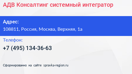 АДВ Консалтинг, системный интегратор по адресу 108811, Россия, Москва, Верхняя, 1а в дальнейшем Организация, размещена в следующих категориях: