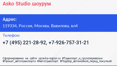 Asko Studio, шоурум по адресу 119334, Россия, Москва, Вавилова, вл4 в дальнейшем Организация, размещена в следующих категориях: