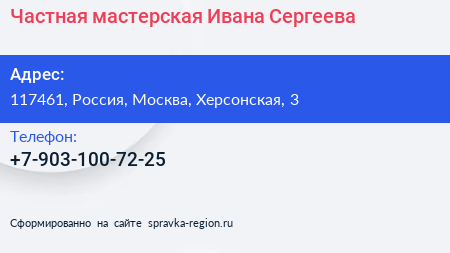 Частная мастерская Ивана Сергеева по адресу 117461, Россия, Москва, Херсонская, 3 в дальнейшем Организация, размещена в следующих категориях: