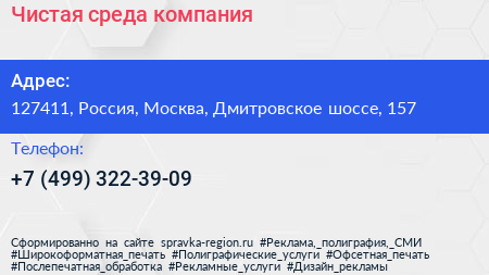 Чистая среда, компания по адресу 127411, Россия, Москва, Дмитровское шоссе, 157 в дальнейшем Организация, размещена в следующих категориях:
