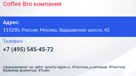 Coffee-Bro, компания по адресу 115230, Россия, Москва, Варшавское шоссе, 42 в дальнейшем Организация, размещена в следующих категориях: