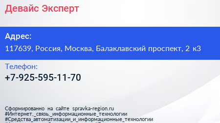 Девайс Эксперт по адресу 117639, Россия, Москва, Балаклавский проспект, 2 к3 в дальнейшем Организация, размещена в следующих категориях: