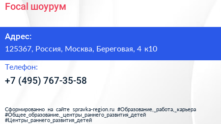 Focal, шоурум по адресу 125367, Россия, Москва, Береговая, 4 к10 в дальнейшем Организация, размещена в следующих категориях: