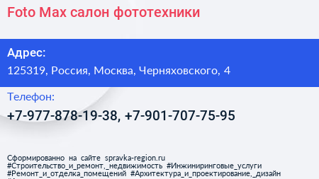 Foto Max, салон фототехники по адресу 125319, Россия, Москва, Черняховского, 4 в дальнейшем Организация, размещена в следующих категориях: