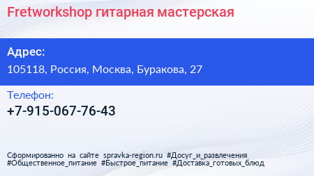 Fretworkshop, гитарная мастерская по адресу 105118, Россия, Москва, Буракова, 27 в дальнейшем Организация, размещена в следующих категориях: