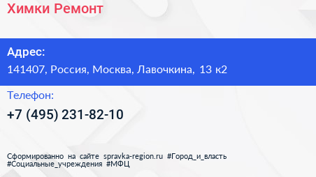 Химки-Ремонт по адресу 141407, Россия, Москва, Лавочкина, 13 к2 в дальнейшем Организация, размещена в следующих категориях: