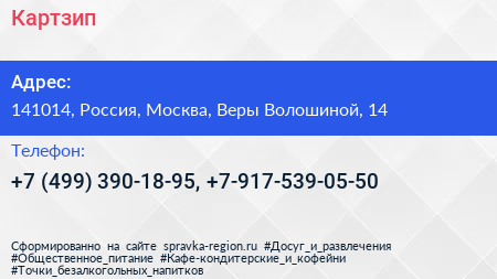Картзип по адресу 141014, Россия, Москва, Веры Волошиной, 14 в дальнейшем Организация, размещена в следующих категориях: