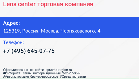 Lens center, торговая компания по адресу 125319, Россия, Москва, Черняховского, 4 в дальнейшем Организация, размещена в следующих категориях: