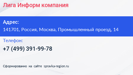 Лига-Информ, компания по адресу 141701, Россия, Москва, Промышленный проезд, 14 в дальнейшем Организация, размещена в следующих категориях: