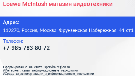 Loewe McIntosh, магазин видеотехники по адресу 119270, Россия, Москва, Фрунзенская Набережная, 44 ст1 в дальнейшем Организация, размещена в следующих категориях: