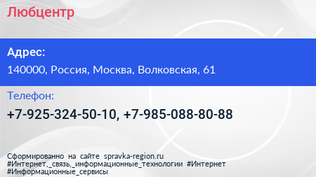 Любцентр по адресу 140000, Россия, Москва, Волковская, 61 в дальнейшем Организация, размещена в следующих категориях: