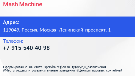 Mash Machine по адресу 119049, Россия, Москва, Ленинский проспект, 1 в дальнейшем Организация, размещена в следующих категориях: