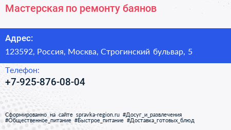 Мастерская по ремонту баянов по адресу 123592, Россия, Москва, Строгинский бульвар, 5 в дальнейшем Организация, размещена в следующих категориях: