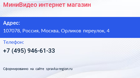 МиниВидео, интернет-магазин по адресу 107078, Россия, Москва, Орликов переулок, 4 в дальнейшем Организация, размещена в следующих категориях:
