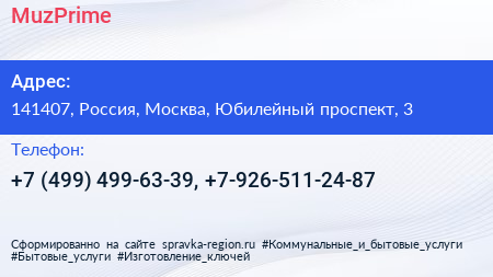 MuzPrime по адресу 141407, Россия, Москва, Юбилейный проспект, 3 в дальнейшем Организация, размещена в следующих категориях: