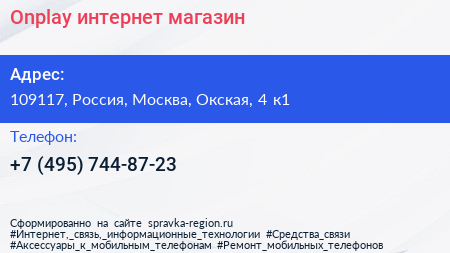 Onplay, интернет-магазин по адресу 109117, Россия, Москва, Окская, 4 к1 в дальнейшем Организация, размещена в следующих категориях: