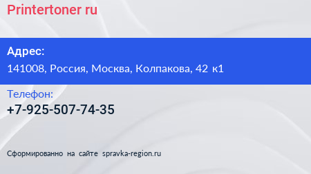 Printertoner.ru по адресу 141008, Россия, Москва, Колпакова, 42 к1 в дальнейшем Организация, размещена в следующих категориях:
