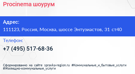 Procinema, шоурум по адресу 111123, Россия, Москва, шоссе Энтузиастов, 31 ст40 в дальнейшем Организация, размещена в следующих категориях: