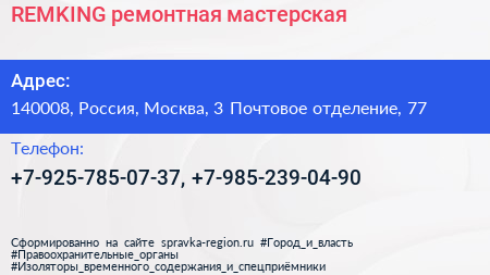 REMKING, ремонтная мастерская по адресу 140008, Россия, Москва, 3 Почтовое отделение, 77 в дальнейшем Организация, размещена в следующих категориях:
