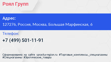 Роял Групп по адресу 127276, Россия, Москва, Большая Марфинская, 6 в дальнейшем Организация, размещена в следующих категориях: