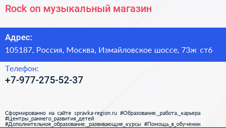 Rock on, музыкальный магазин по адресу 105187, Россия, Москва, Измайловское шоссе, 73ж ст6 в дальнейшем Организация, размещена в следующих категориях: