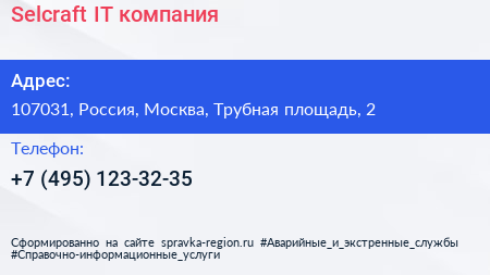 Selcraft, IT-компания по адресу 107031, Россия, Москва, Трубная площадь, 2 в дальнейшем Организация, размещена в следующих категориях: