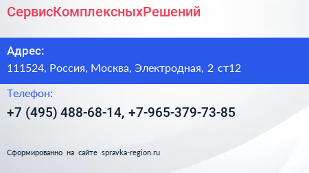 СервисКомплексныхРешений по адресу 111524, Россия, Москва, Электродная, 2 ст12 в дальнейшем Организация, размещена в следующих категориях: