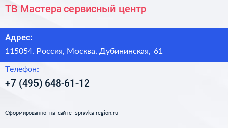 ТВ-Мастера, сервисный центр по адресу 115054, Россия, Москва, Дубининская, 61 в дальнейшем Организация, размещена в следующих категориях:
