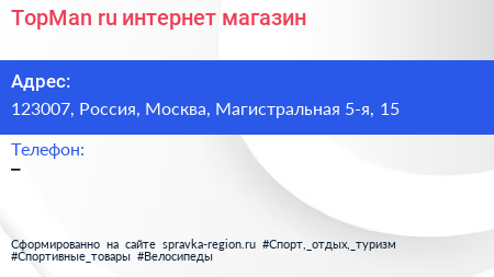 TopMan.ru, интернет-магазин по адресу 123007, Россия, Москва, Магистральная 5-я, 15 в дальнейшем Организация, размещена в следующих категориях: