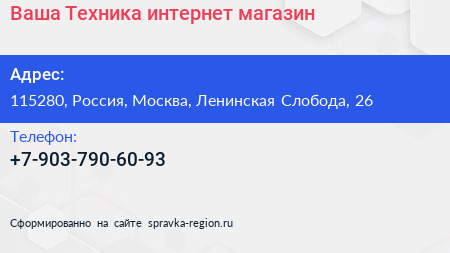 Ваша Техника, интернет-магазин по адресу 115280, Россия, Москва, Ленинская Слобода, 26 в дальнейшем Организация, размещена в следующих категориях: