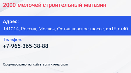 2000 мелочей, строительный магазин по адресу 141014, Россия, Москва, Осташковское шоссе, вл1Б ст40 в дальнейшем Организация, размещена в следующих категориях: