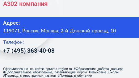 A302, компания по адресу 119071, Россия, Москва, 2-й Донской проезд, 10 в дальнейшем Организация, размещена в следующих категориях: