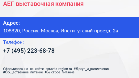 АЕГ, выставочная компания по адресу 108820, Россия, Москва, Институтский проезд, 2а в дальнейшем Организация, размещена в следующих категориях: