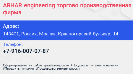 ARHAR engineering, торгово-производственная фирма по адресу 143401, Россия, Москва, Красногорский бульвар, 14 в дальнейшем Организация, размещена в следующих категориях: