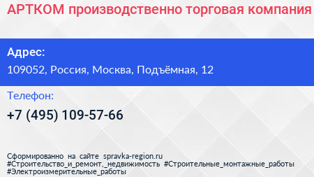 АРТКОМ, производственно-торговая компания по адресу 109052, Россия, Москва, Подъёмная, 12 в дальнейшем Организация, размещена в следующих категориях:
