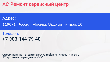 АС-Ремонт, сервисный центр по адресу 119071, Россия, Москва, Орджоникидзе, 10 в дальнейшем Организация, размещена в следующих категориях: