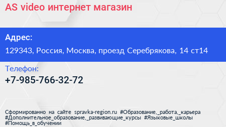AS-video, интернет-магазин по адресу 129343, Россия, Москва, проезд Серебрякова, 14 ст14 в дальнейшем Организация, размещена в следующих категориях: