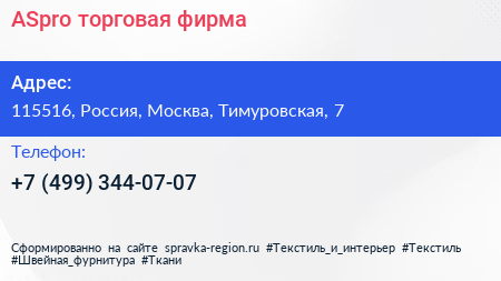 ASpro, торговая фирма по адресу 115516, Россия, Москва, Тимуровская, 7 в дальнейшем Организация, размещена в следующих категориях: